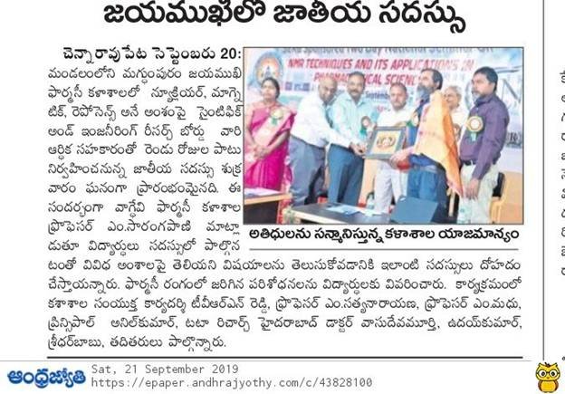 The Jayamukhi College of Pharmacy, Narsampet, Warangal organized a two day national level seminar on NMR techniques and its applications in pharmaceutical sciences on 20th and 21st September 2019 with support of SERB. The Day one-session started with inauguration by chief guest Prof.M.Sarangapani, Dean, faculty of pharmaceutical sciences, Kakatiya University and key note speaker Prof.P.K.Madhu, Sr. Scientist, Tata Institute of Fundamental Research (TIFR), Hyderabad. Prof.Y.Madhusudan Rao, Director, Vaagdevi group of pharmacy institutions was presided over the function.