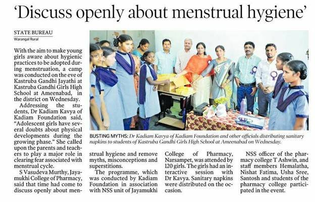 Awareness Health Camp was conducted for school girls of 6th to 10th classes of Kasturba Gandhi Balika Vidyalaya. The day-long awareness programme was facilitated by Dr. Kadhiam Kavya (chairperson of Kadiam Foundation), Mr. A. Srivas (Lecturer of Kadiam Foundation) who are well experienced on the subject. The facilitators used Telugu and English languages simultaneously to convince the students more effectively. In addition, the facilitators used pictorial images (posters), participatory adult learning tools, and Menstrual Health Management and Hand-washing animated videos aiming for easy understanding by all age groups of students. The students were educated, sensitized and made aware on as follows: