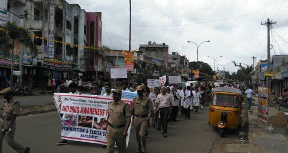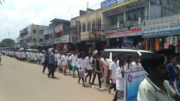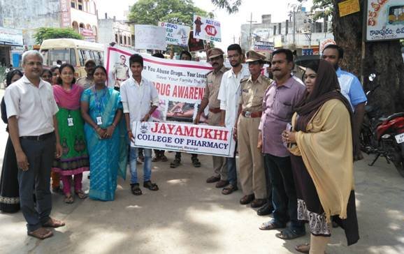 In association with Excise Department of Narsampet, Warangal rural a rally for bringing the awareness among the youth and general masses against drugs addiction and abuse, was taken out from Narsampet on the call given by Government of Telangana on explicit use of drugs on 4th Aug, 2017. Students and faculty of Jayamukhi College of Pharmacy participated in rally in Narsampet creating awareness on drug abuse among people.