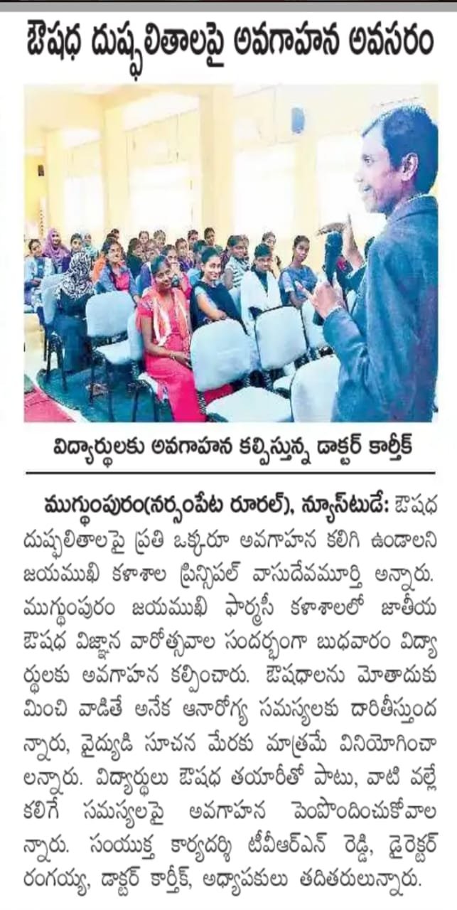 Due to inappropriate and misuse of medicines causing health hazards, this requires a clinical attention of physicians and clinical pharmacists. Poly-pharmacy and incorrect use of drugs are commonly encountered by the patients’ world over. In order to raise awareness among public about implementation of rational use of drugs, this year ‘World Pharmacist Day’ celebrated with full fanfare at Jayamukhi College of Pharmacy. While addressing Principal Dr. S. Vasudeva Murthy given a call for appropriate implementation of rational use of medicines. In his communication reiterated to the students to take up pharmacovigilance program and prescription audit. A ralley was organized in Narsampet town to create awareness among public.