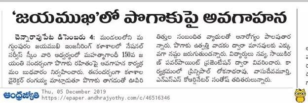 POn 14th December Pharm.D 5th and 6th year students gave awareness to students of Jayamukhi group of institutions as well as local people of Narsampet about
